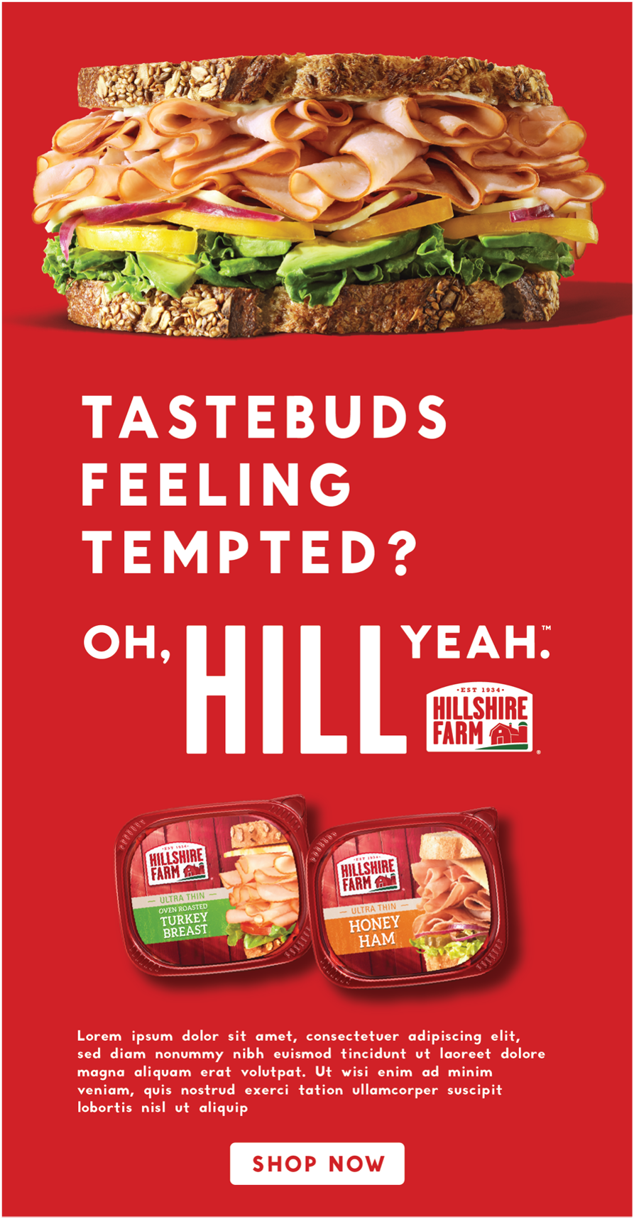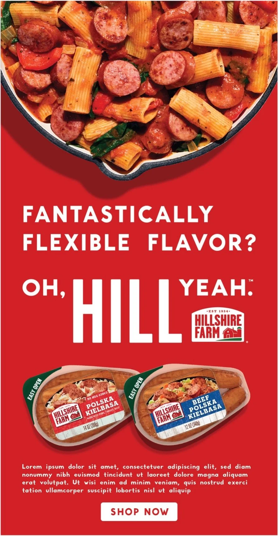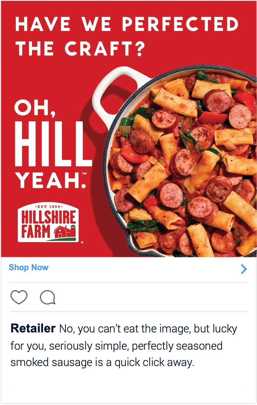 A big part of our job was adapting above the line campaigns to work within the shopper space. Hillshire Farm’s Oh, Hill Yeah campaign presented a couple challenges. One, it was a copy-forward campaign. Which, kudos to the writer who sold that in. That’s the dream. But in our space, we have things like character counts and digital banner-sized limits to consider. We also worked with retailers who felt uncomfortable using such ‘edgy’ language. Here are a couple examples of what we were working against:
