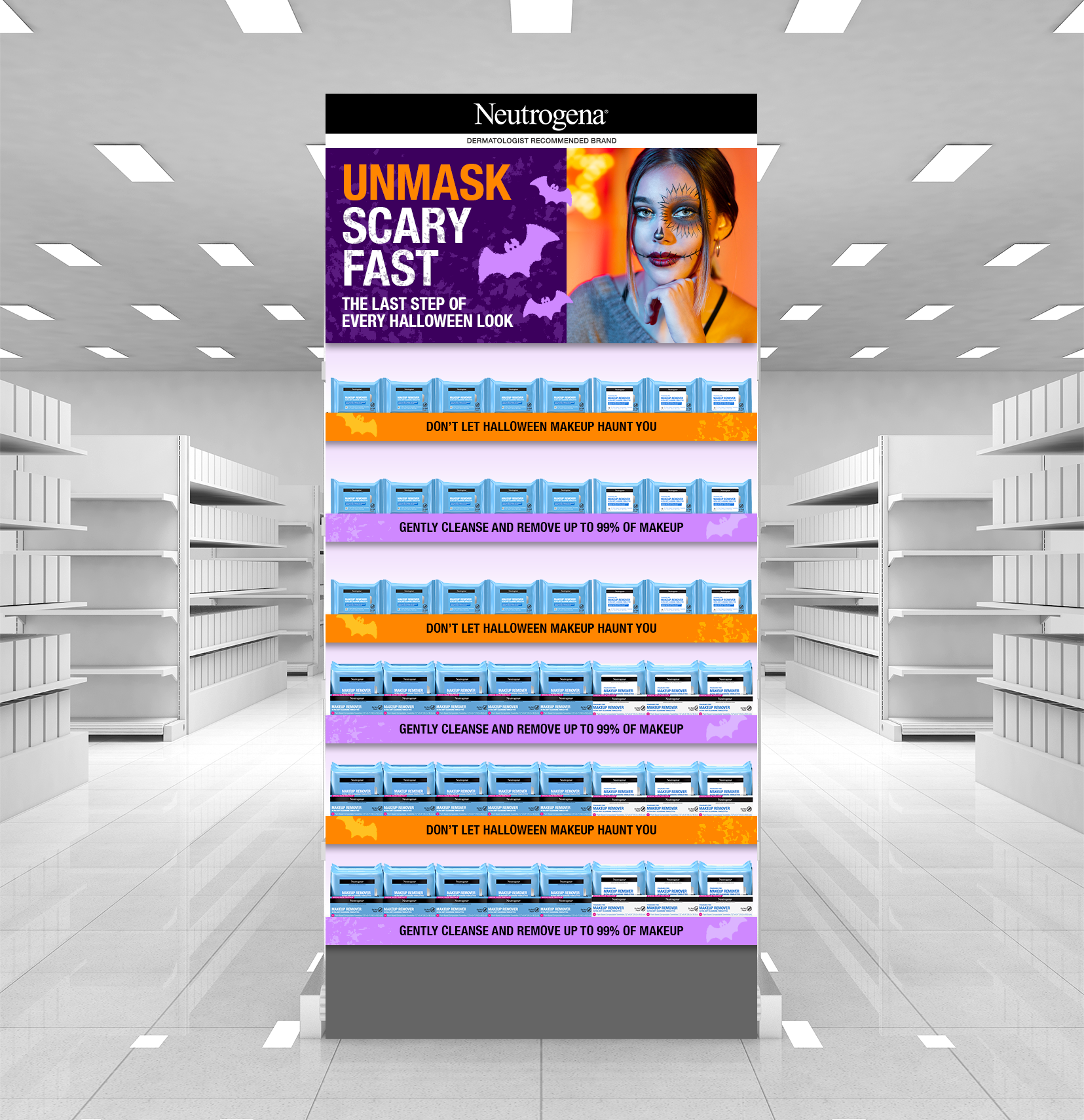 This originally started as a sell-in banner assignment. Kenvue found an opportunity to pair their makeup wipes with the Halloween supplies on Walmart.com and wanted us to help them naturally bridge the products together. I gave them this line, which resulted in two wins. One, they started specifically asking for “Drew copy”. Two, the following incremental display.